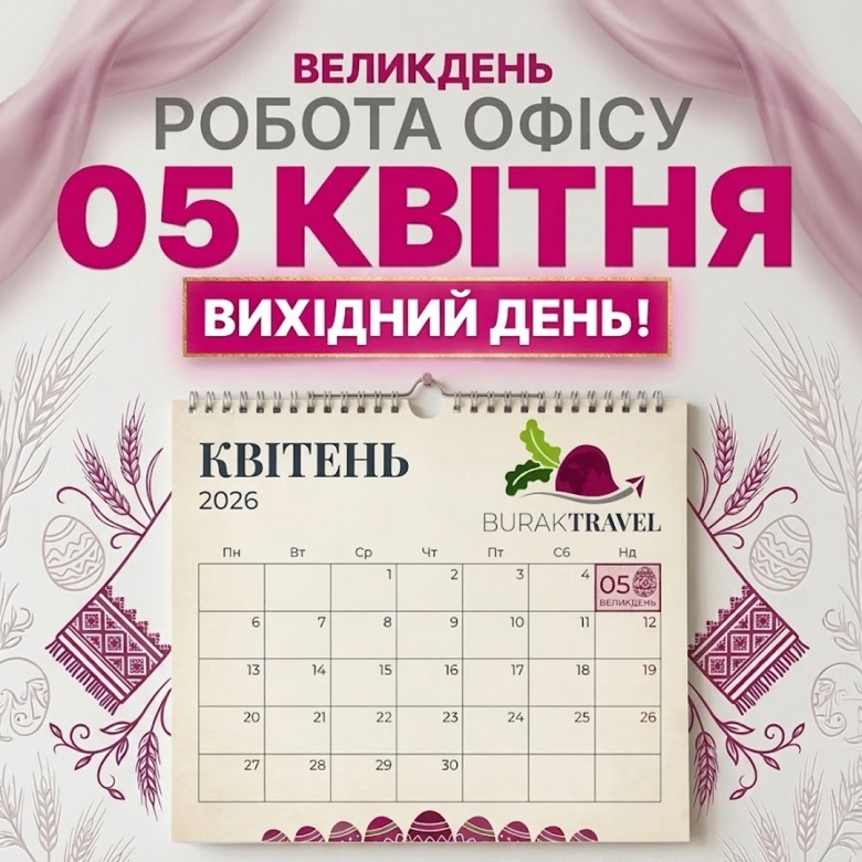 Повідомляємо, що у зв’язку з Великоднем офіс BURAK TRAVEL не працюватиме 5 квітня 2026 року. Усі інші дні — за звичайним графіком.
